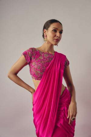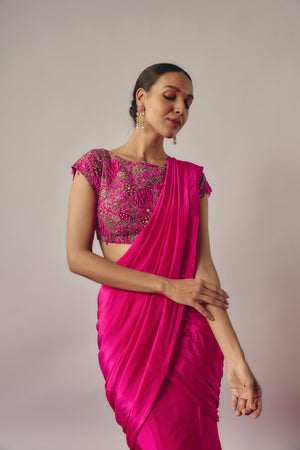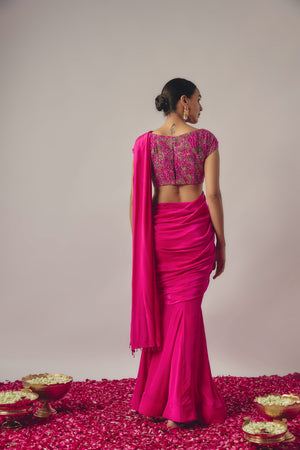 Featuring A Fuchsia Pink Mermaid Cut Draped Lehenga In Crepe Base It Is Paired With Matching Hand Embroidered Blouse.