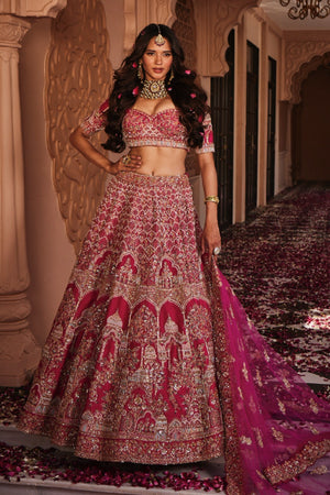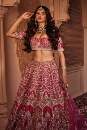 Featuring Rani raw silk lehenga which has temple motives with intricate hand embroidery comes with a compact jaal blouse paired with a net dupatta which has scallop border.