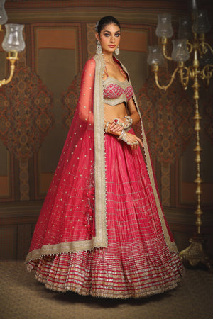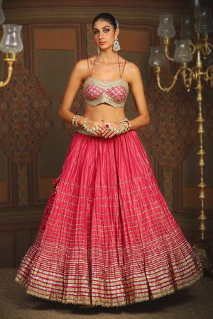 Capture Youthful Vibrancy In Our Shimmer Chanderi Crinkle Lehenga, Bathed In The Enchanting Rani Pink Hue, Perfectly Complementing The Intricacies Of Fine Gota Work. The Lehenga’S Rich Color, Combined With Its Crinkle Texture, Adds A Touch Of Contemporary Flair. The Accompanying Net Dupatta Drapes Elegantly, Complimenting The Ensemble’S Liveliness While The Blouse With Its Elegant Noodle Straps, Exudes Modern Allure, Thus, Making The Ensemble An Irresistible Choice For Young Girls, Effortlessly Merging Tradition With Trend.