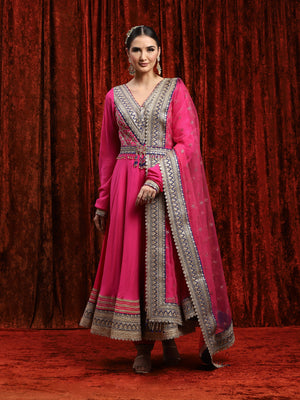Indulge in the regal allure of our rani pink silk chanderi anarkali suit, accentuated with vibrant electric blue detailing for a modern twist. Embellished with exquisite gota, dori, badla and kasab work, this ensemble exudes opulence. Paired with a delicate net duppata and churidar, it offers a complete traditional look. To elevate the silhouete, a belt feturing delicate tassel detailing cinches the waist, adding a graceful flourish to one's look.