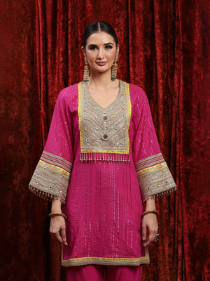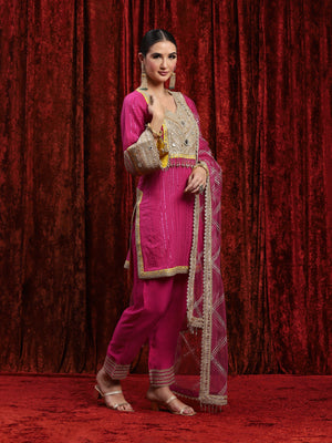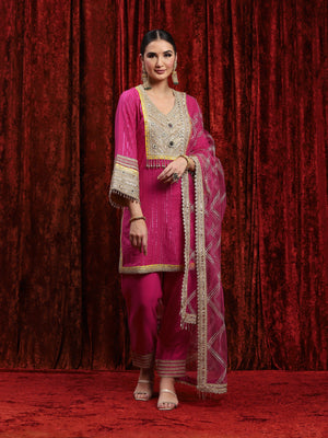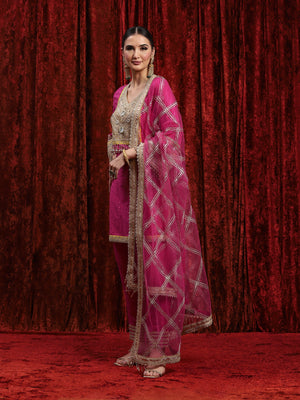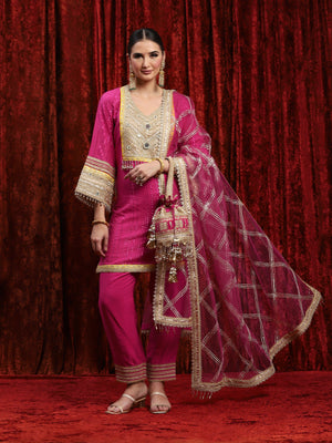 Elevate your style with our Rani pink and Yellow kurta, pant and dupatta set, intricately adorned with delicate Gota, Dori and Badla work. The net dupatta drapes gracefully, while the silk chanderi pants exudes sophistication. The cotton shimmer kurta, featuring a paan neckline , ensures both style and comfort.