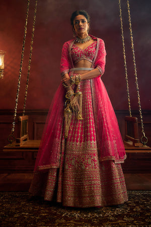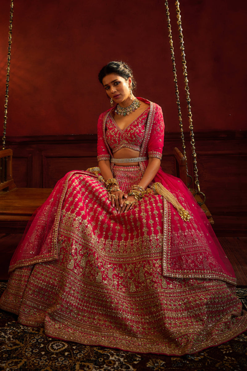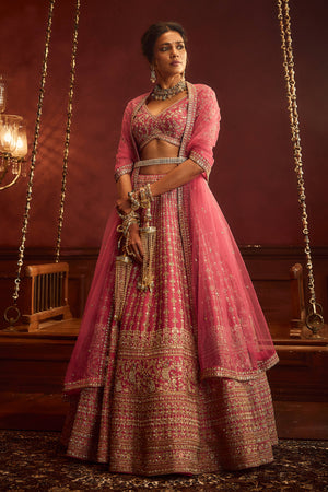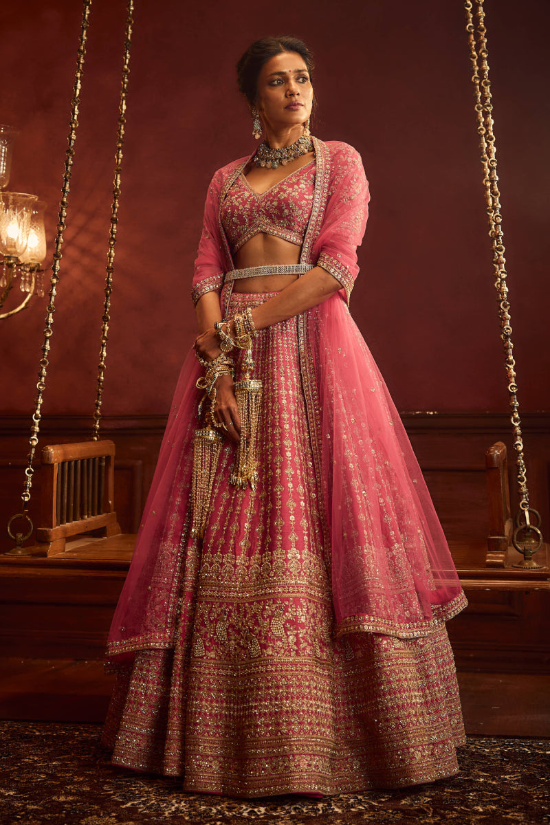 Rani Pink Raw Silk Hand & Machine Embroidered Lehenga Set