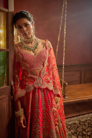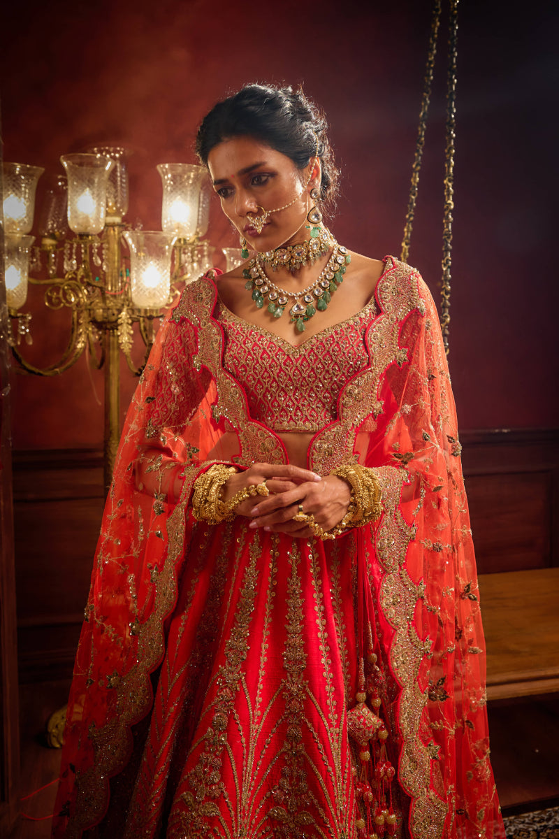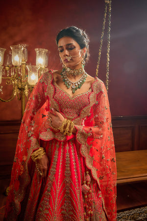 Kalighata features a mesmerizing Rani Pink Lehenga Set that captivates with its elegance. The eye-catching lehenga is crafted in raw silk with hand and machine embroidery. It is paired with a blouse and two dupattas. Accessorize it with statement earrings and heels for weddings or engagement ceremonies.
