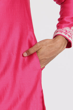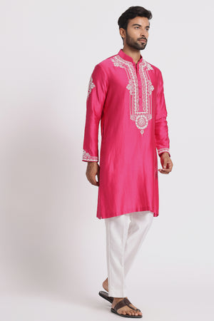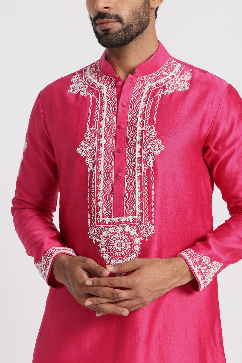 This elegant Rani Pink kurta is crafted from soft Chanderi fabric and adorned with delicate white hand embroidery, adding a refined charm to its bold hue. Paired with a contrasting white pant, the ensemble beautifully balances vibrancy with subtlety Color :- RANI PINK- WHITE