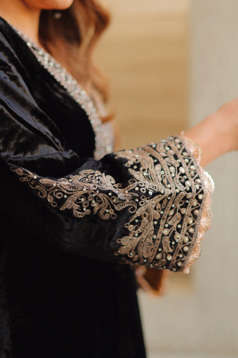 This ensemble is crafted from luxurious pure silk velvet, exuding elegance and sophistication. Adorned with intricate kirandori embroidery and shimmering sitaara, it adds a touch of royal charm. The long kaftan features a bold, deep V neckline at the front, a daring zero back, and flattering three-quarter sleeves. Paired with a traditional Dogri salwar, the entire outfit is beautifully finished with delicate pure tissue fabric and a detailed kinari trim, making it a stunning choice for any special occasion.