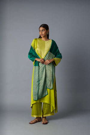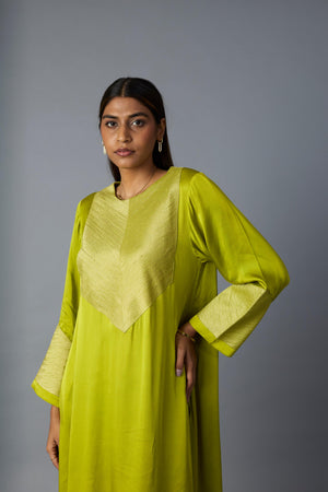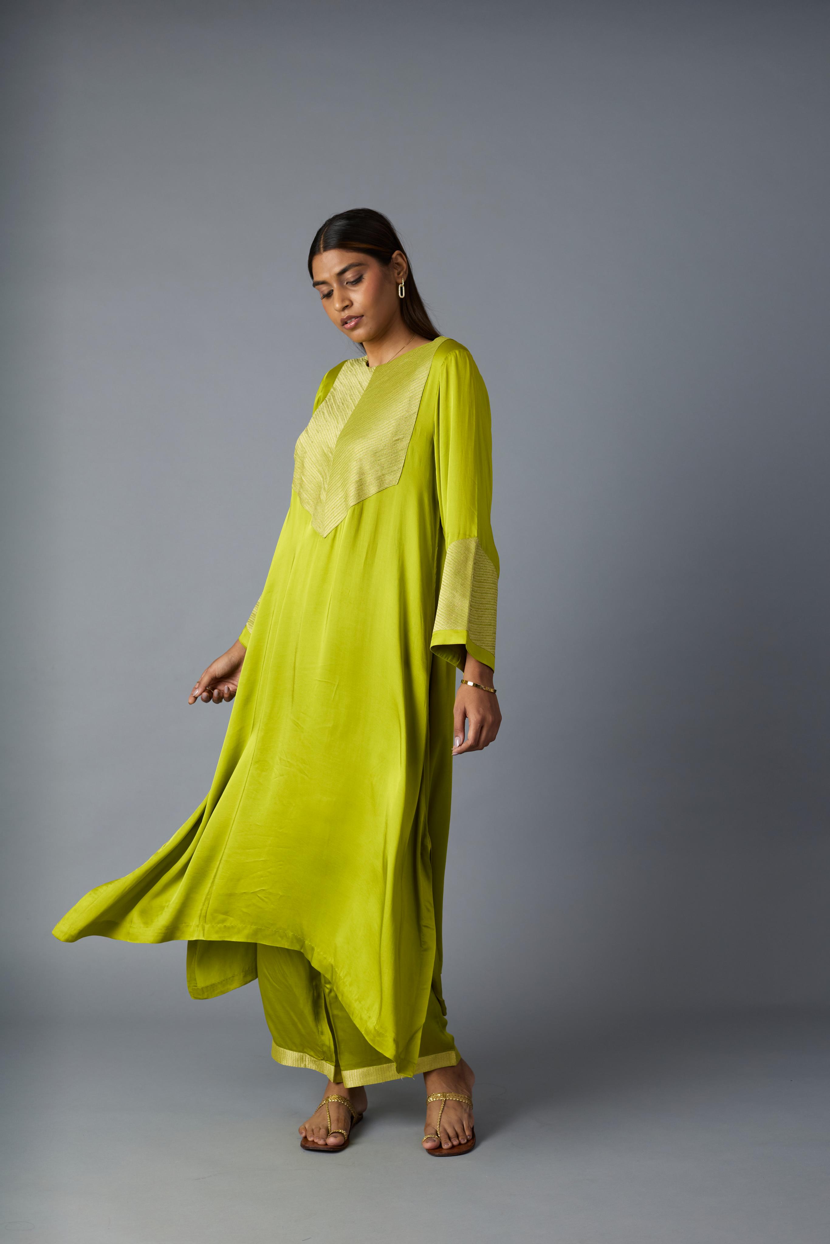 The combination of metallic Banarasi Zari on the front and back yoke in this two piece co-ord set in modal satin creates a rich, traditional appeal, while the modal satin pants add a luxurious yet comfortable touch. The geometric Zari placement on the sleeves gives it a structured, contemporary element.