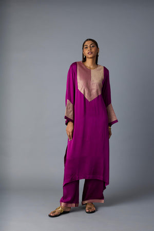 The combination of metallic Banarasi Zari on the front and back yoke in this two piece co-ord set in modal satin creates a rich, traditional appeal, while the modal satin pants add a luxurious yet comfortable touch. The geometric Zari placement on the sleeves gives it a structured, contemporary element.