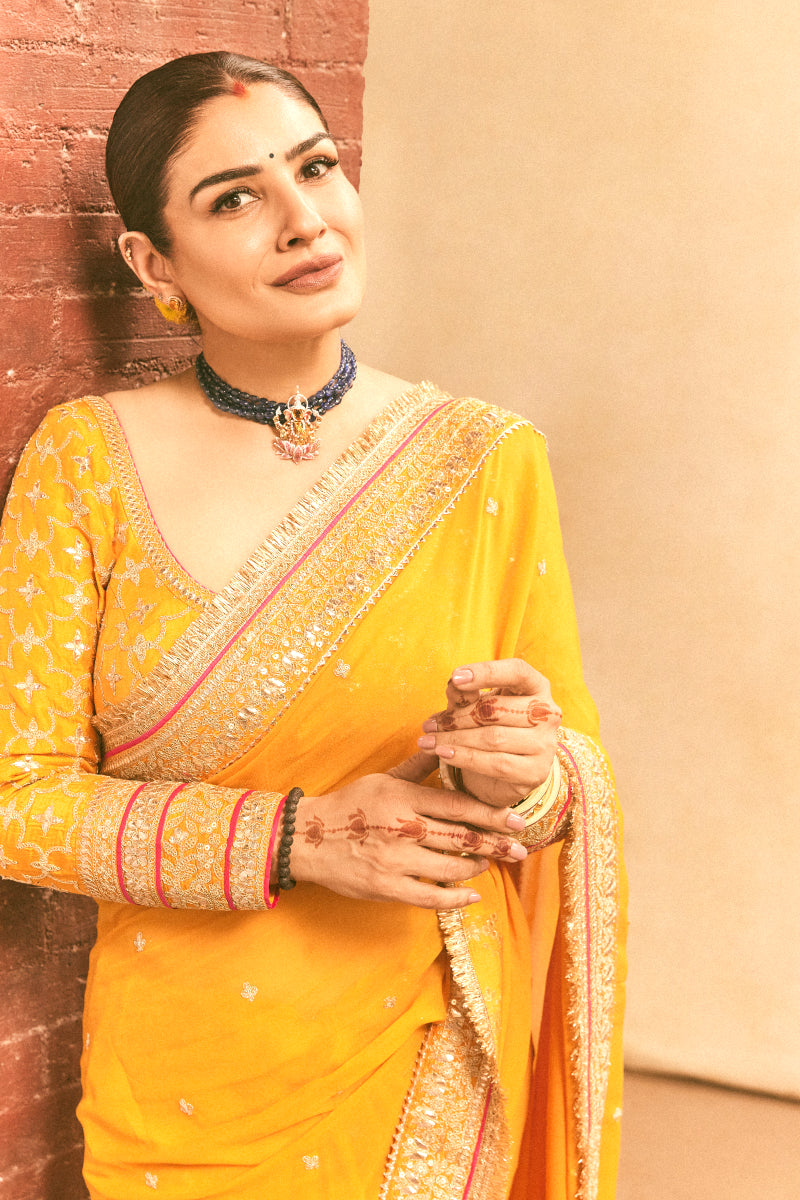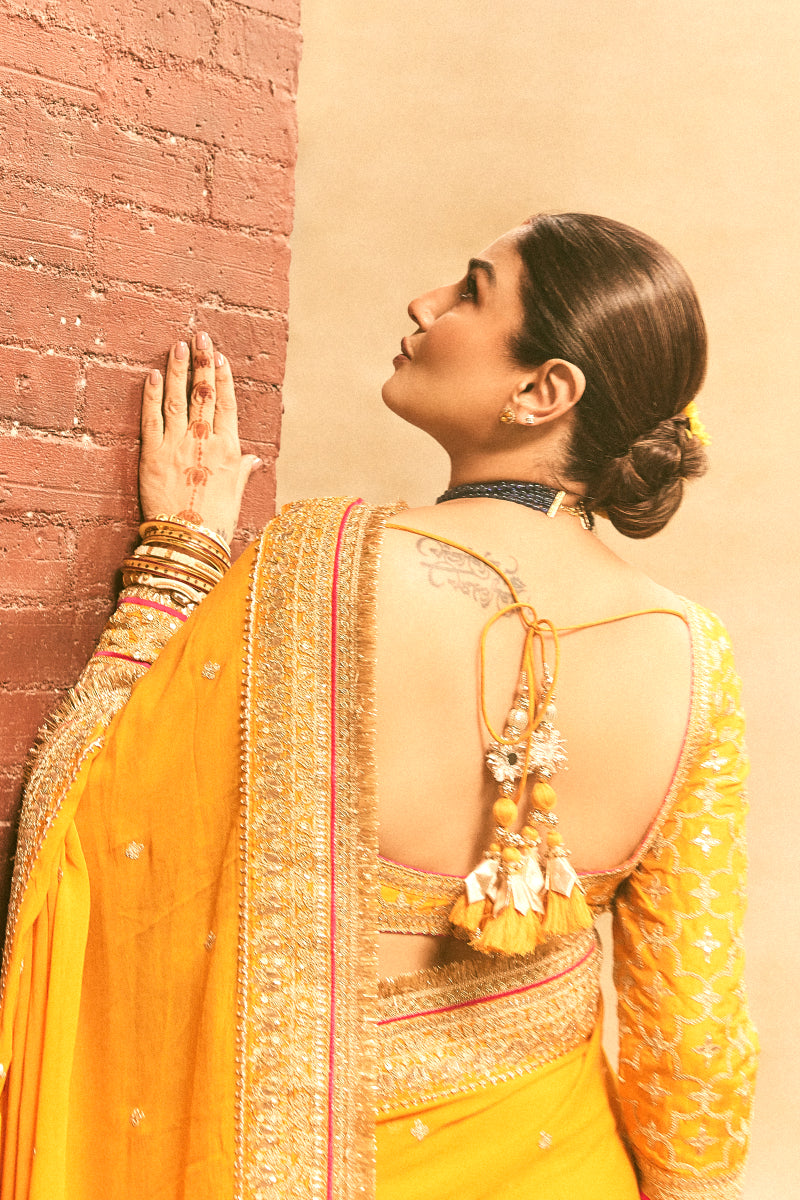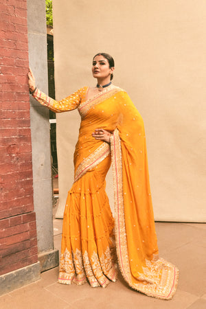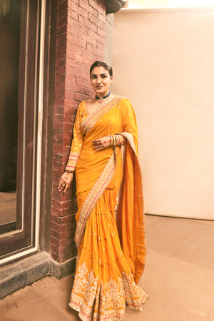 The saree features an intricately embroidered border. The gracefully pleated drape flows into a richly adorned hemline adding grandeur to the ensemble. Paired with a matching full-sleeved blouse showcasing all-over embroidery this saree strikes the perfect balance between traditional artistry and contemporary elegance.
