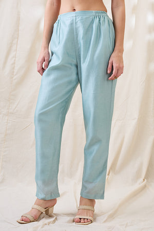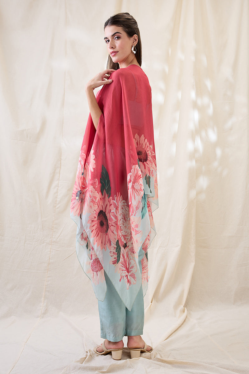 Blue Ravya solid bustier and pants in chanderi, paired with embroidered cape in chiffon.