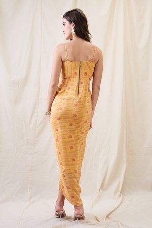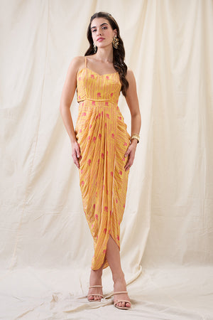 Yellow Ravya printed drape dress in crepe, paired with pink embroidered cape in chiffon.