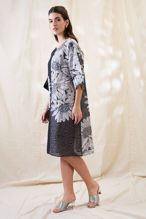 Black and grey color blocked Ravya embroidered dress with half sleeves in linen.