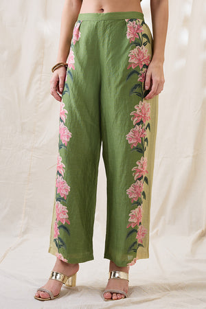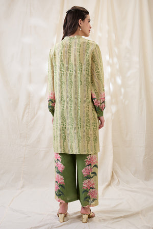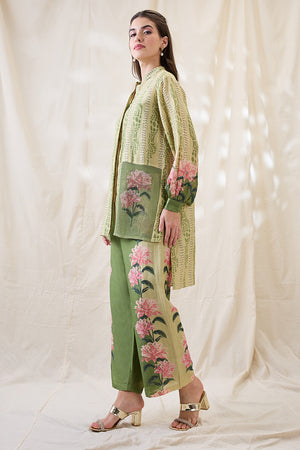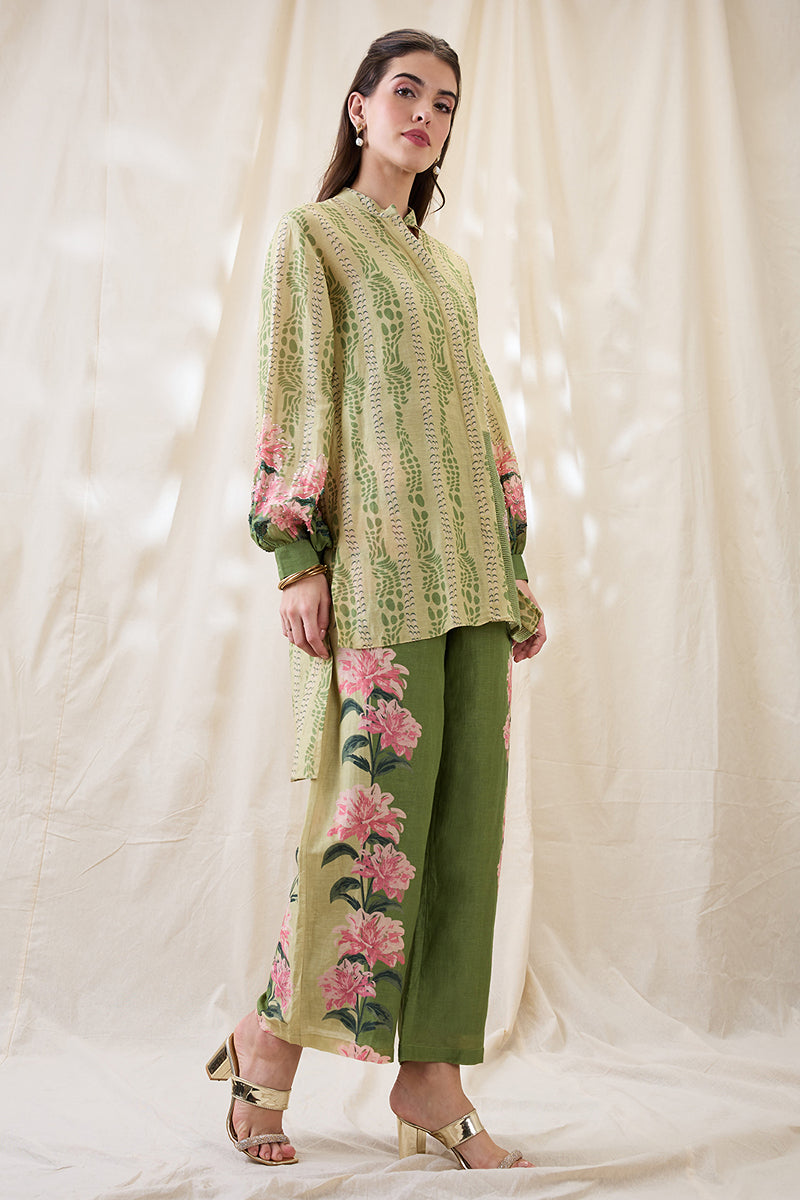 Green Ravya embellished high-low shirt with full sleeves, paired with straight pants in linen.
