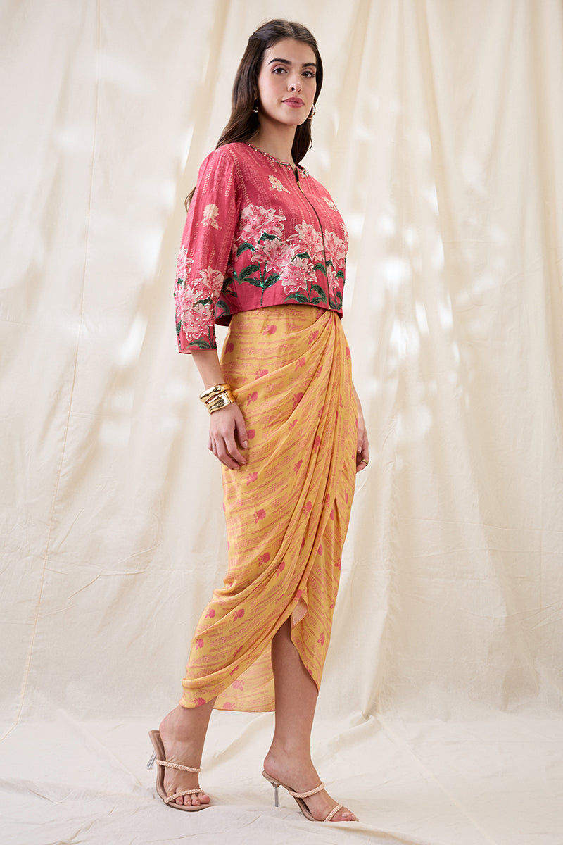Yellow Ravya printed drape dress in crepe, paired with pink embroidered jacket in linen.