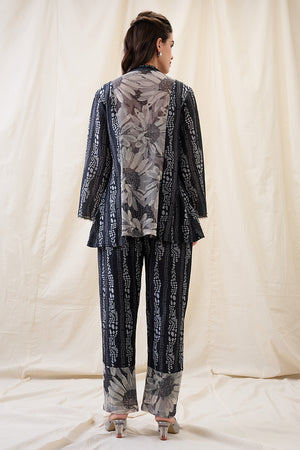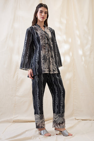 Black Noorani embellished shirt top with front tie-ups, comes with a slip. Paired with printed pants in linen.