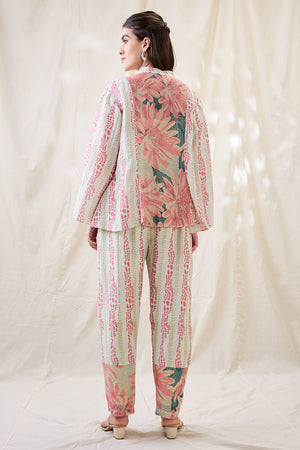 Multicolor Noorani embellished shirt top with front tie-ups, comes with a slip. Paired with printed pants in linen.