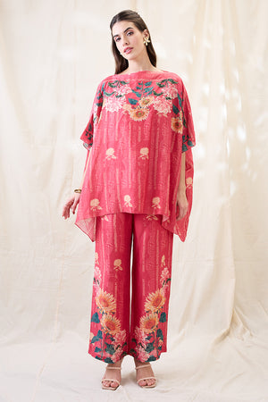 Pink Ravya embroidered kimono top, paired with straight pants in linen.