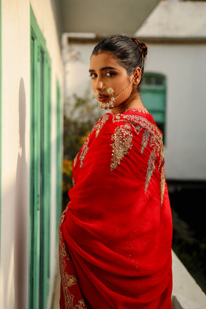 The red zari embroidered, Razaa Saree, is a true masterpiece, designed to make you stand out and steal the spotlight at any occasion. The delicate detailing in shimmering zari threads creates a mesmerizing interplay of light and texture, making it a perfect choice for your special occasions and celebrations. Razaa saree defines Indian heritage and precise craftmanship.