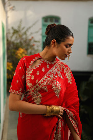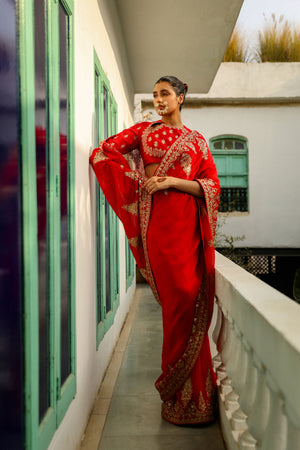 Scarlet red zari embroidered saree with embroidered tonal blouse
