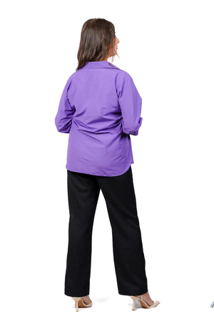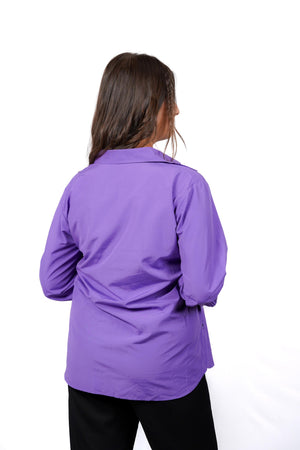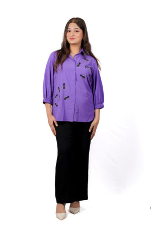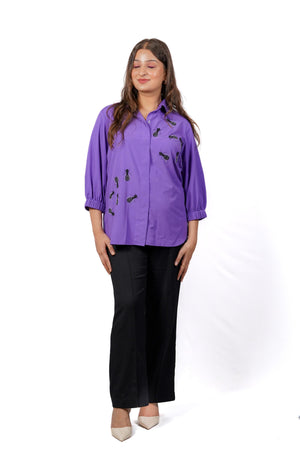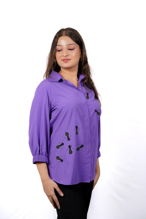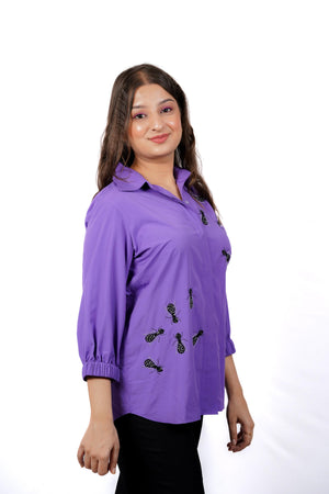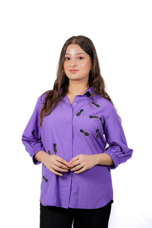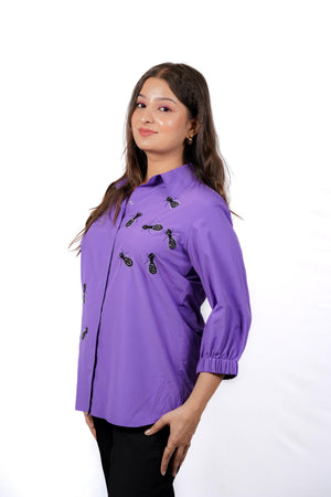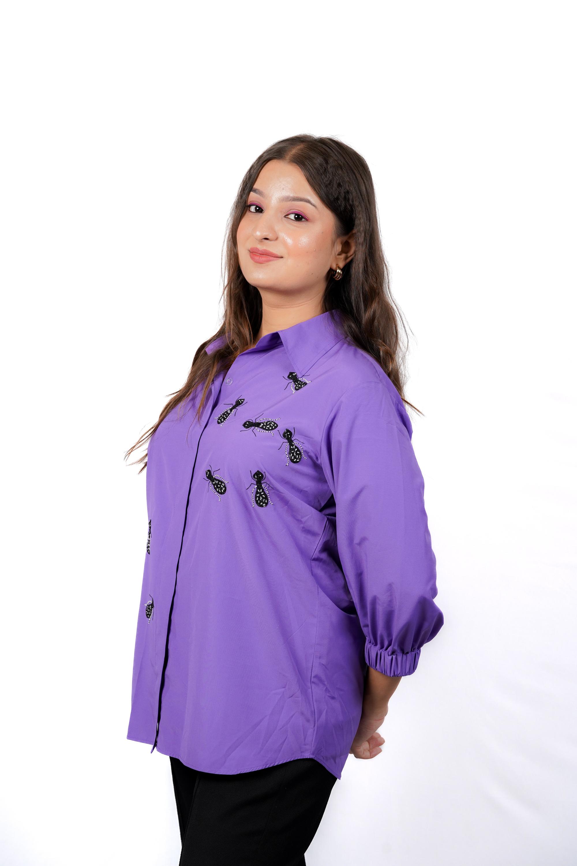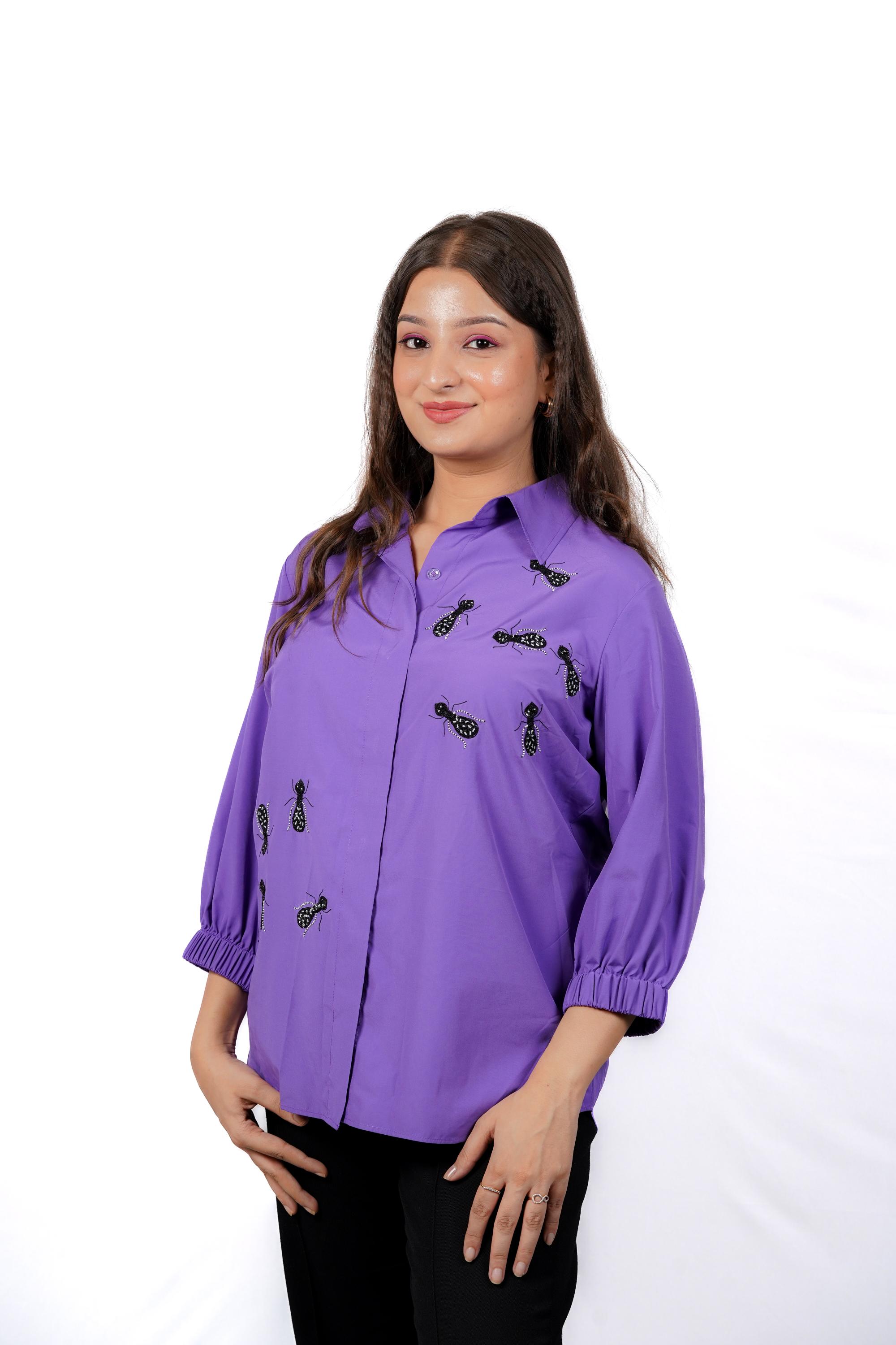 Our Purple Ant shirt features a classic shirt collar and concealed front button closure. Finished with an elasticated cuff and hand embroidered Ants.