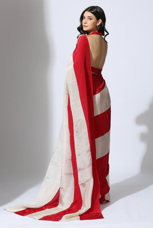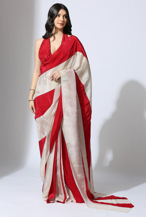 Red and Beige stripe colour block pre-draped saree