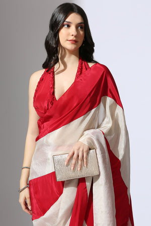 Featuring red and beige tissue colour block stripe pre-stitched saree