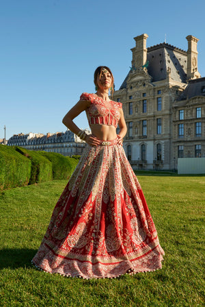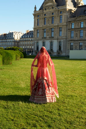 Red Lehenga Set, adorned with exquisite handwork embroidery and pearl details. Crafted from luxurious raw silk, the lehenga and blouse create a regal silhouette, while the net dupatta adds a graceful finish.