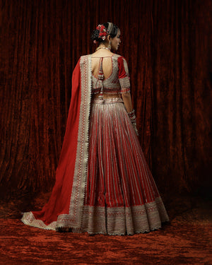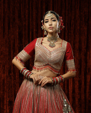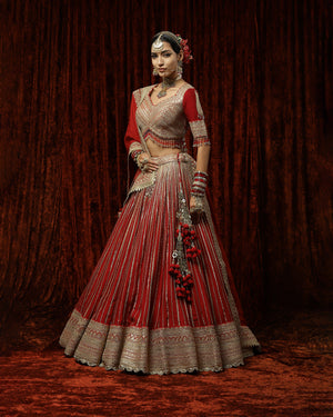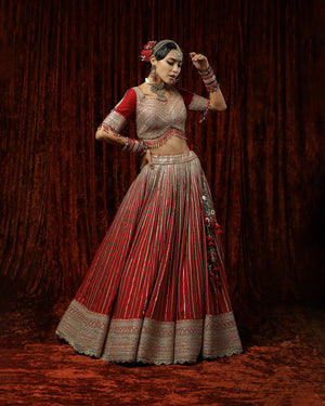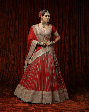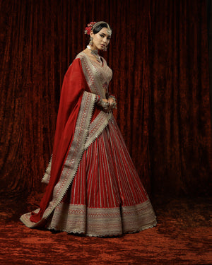 "Beautiful Crimson red lehenga with fine gota, dori & badla work. Lehenga complements with a Silk Chanderi blouse and pure crape dupatta. This entire ensemble is exquisite in itself because of its color and the beautiful embroidery.