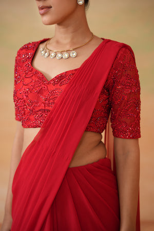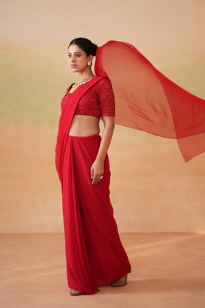 Deepika Chadha's stunning Red dupion fabric is blouse beautifully adorned with intricate tonal sequins, cutdana, thread, embroidery. The flowy Georgette stitched saree is perfect for wedding and festive season.