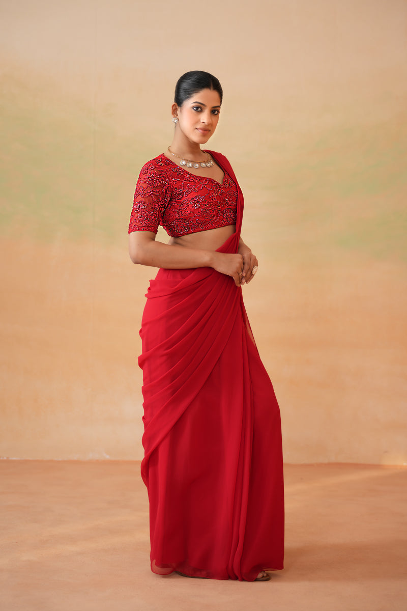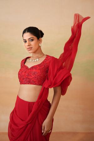 Red Embroidered Blouse And Stitched Saree Set