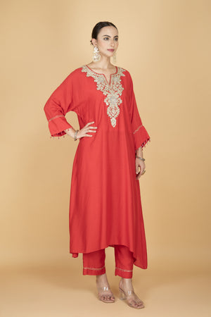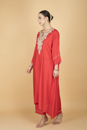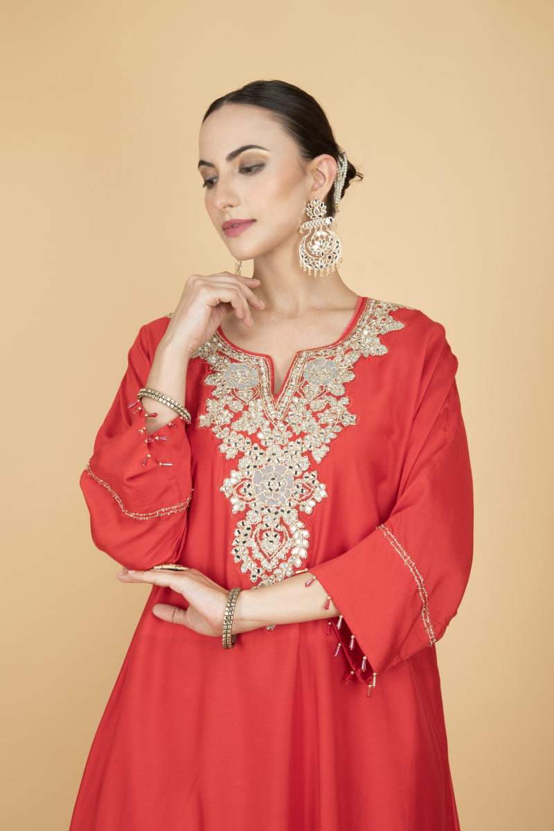 Featuring a high-low red kaftaan kurta in cotton silk, embellished with intricate hand-embroidered work on the neckline, paired with coordinating pants in cotton silk.