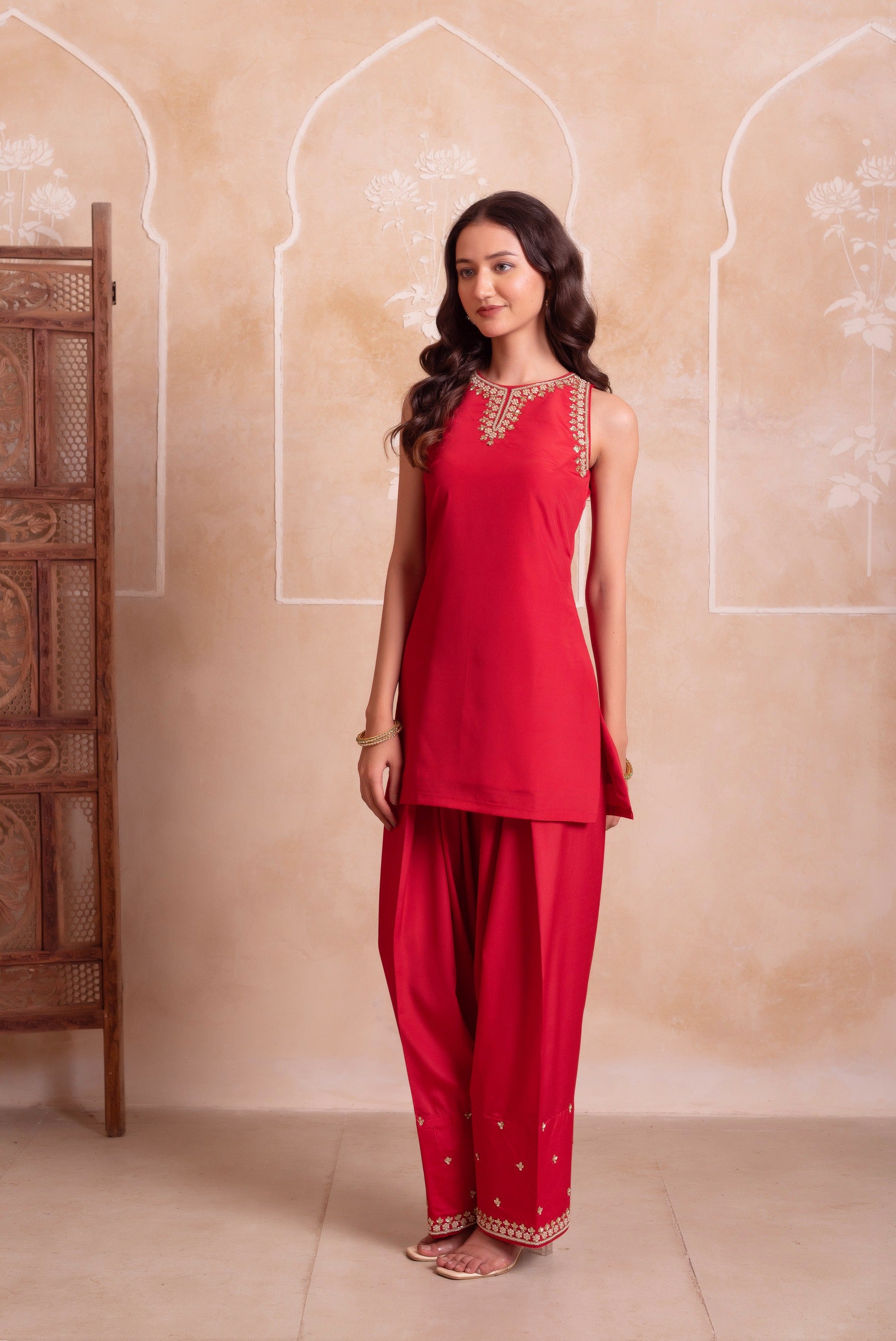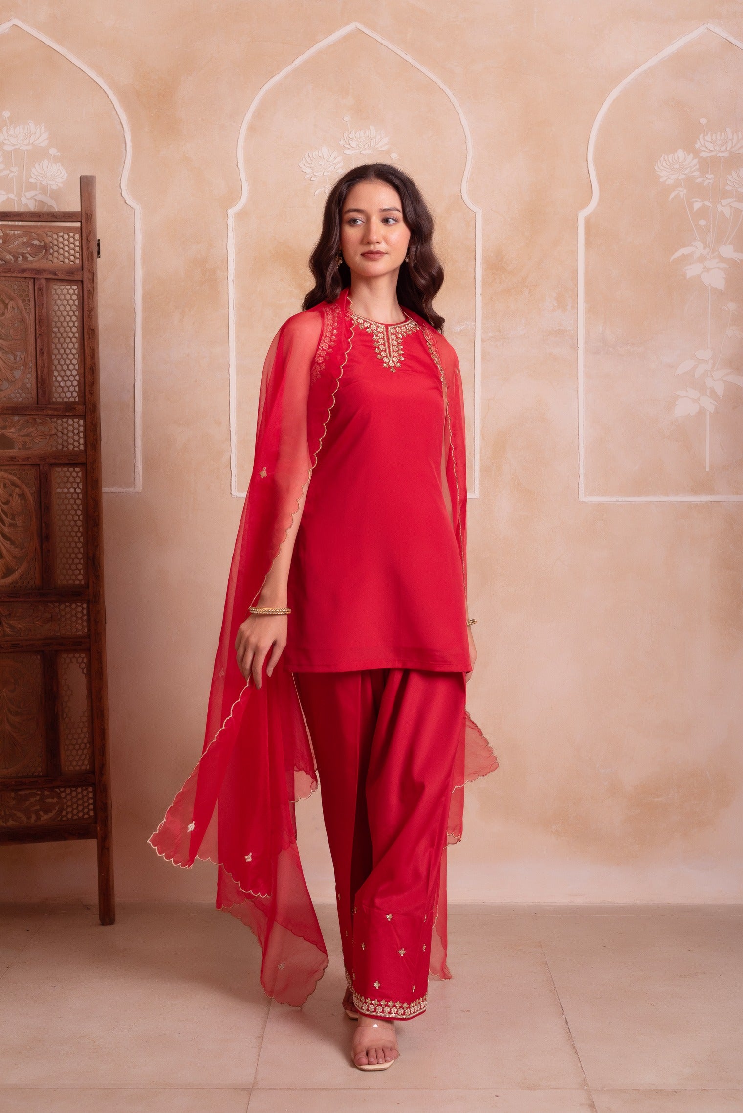 Inspired by classic farshi silhouettes, this red crepe set offers rich traditional elegance. The hand worked dupatta completes the festive look. Perfect for weddings and cultural gatherings.