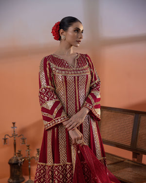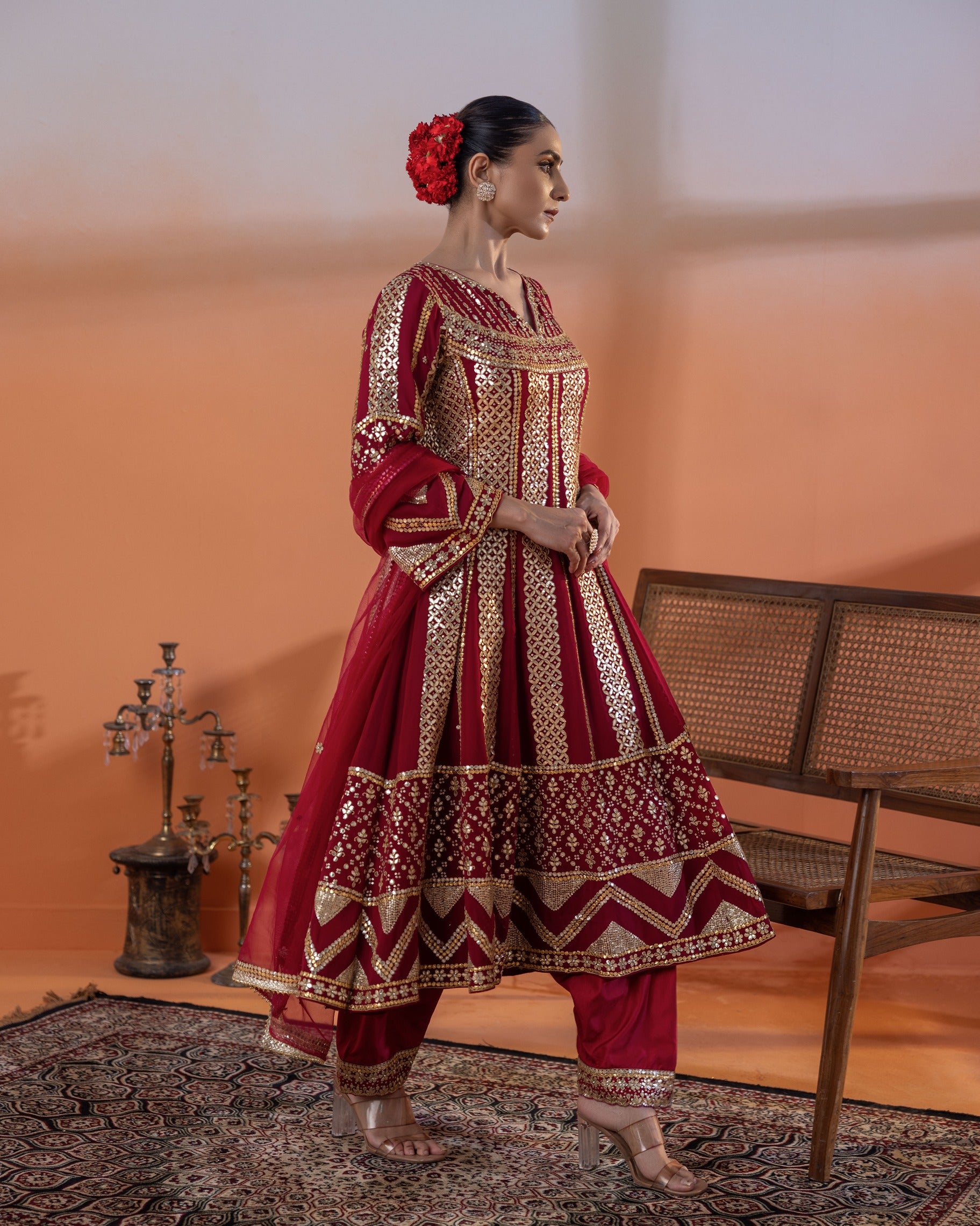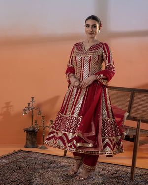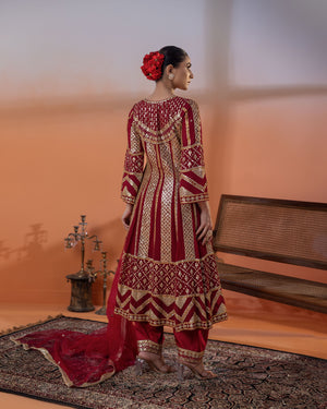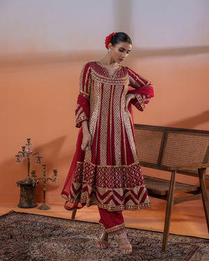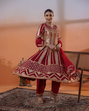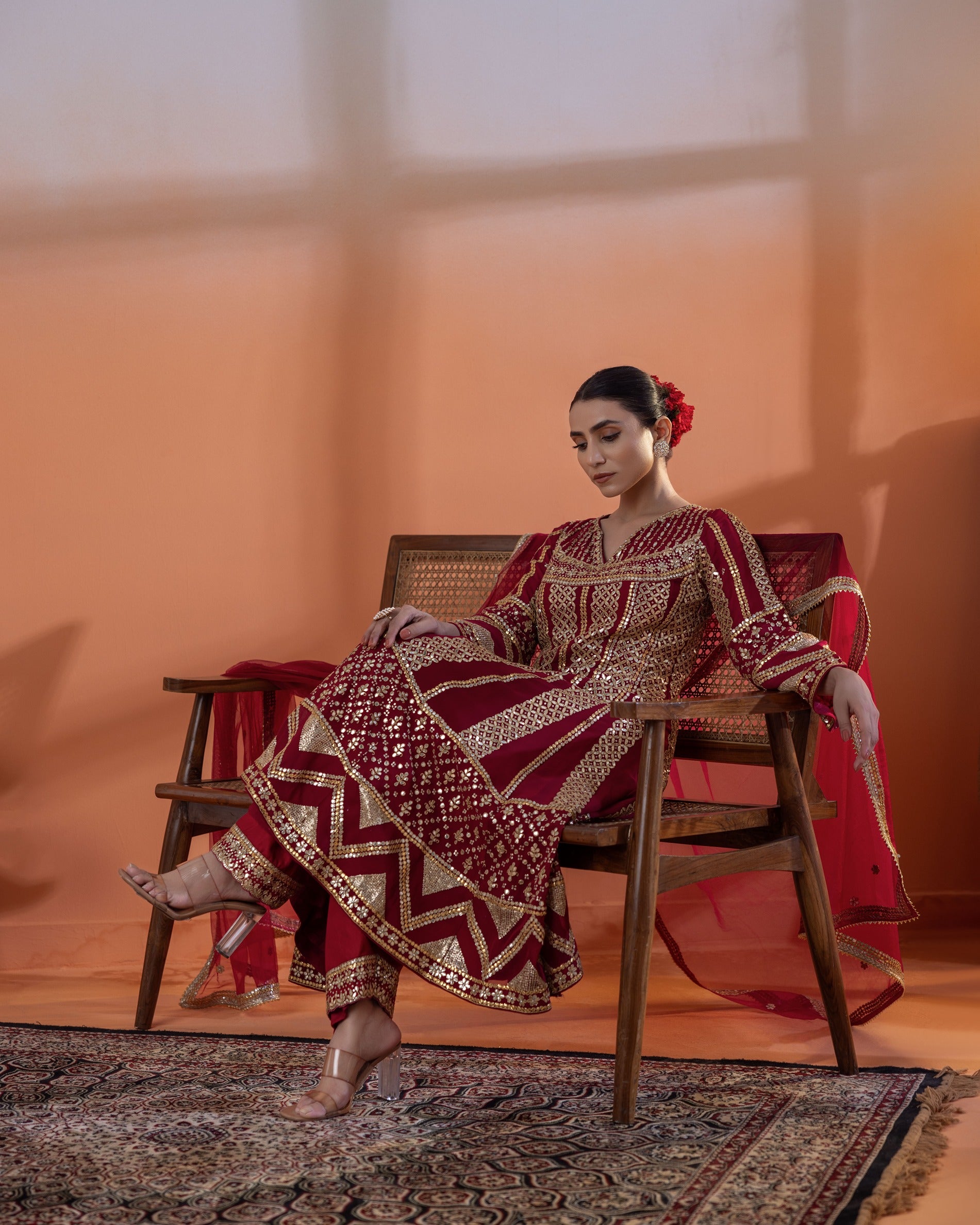 A striking red ensemble crafted from lightweight georgette, featuring an A-line shirt adorned with intricate Dori and Gota embellishments. Paired with stylish salwar pants and a delicately draped dupatta.