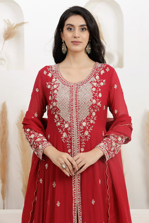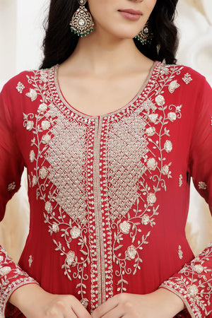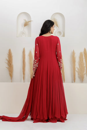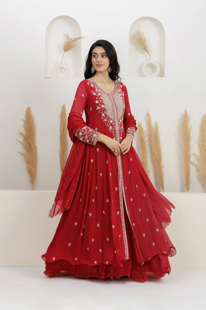 Red double layered anarkali in georgette base with cutdana, pearl and sequins embroidery comes with sccalpas Dupatta.