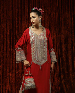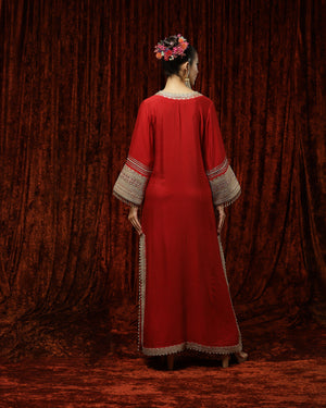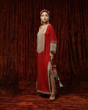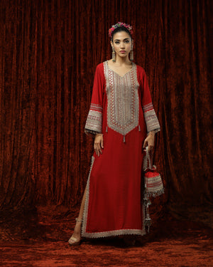 Featuring a Red Kurta kaftan in Silk Chanderi and with fine gota, dori, badla work.