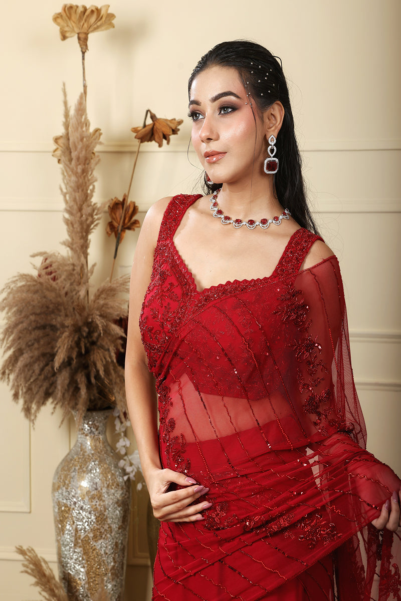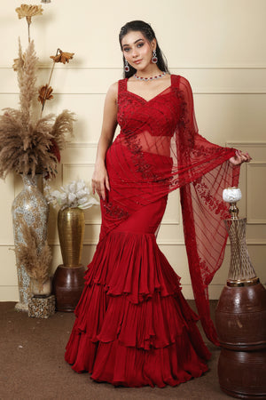 Red layered mermaid cut skirt paired with a blouse & tulle drape featuring monotone zardozi work