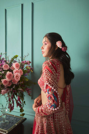 Featuring a magnificent red lehenga set in raw silk base, an ideal and aesthetically designed for a contemporary Indian bride. This timeless lehenga set has ageless craftsmanship of zardosi and cutdana work. It is gracefully accented with pearl, french knot detailing and peacock motif at the hem of the lehenga. This set includes a net dupatta to complete the bride's look.