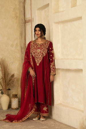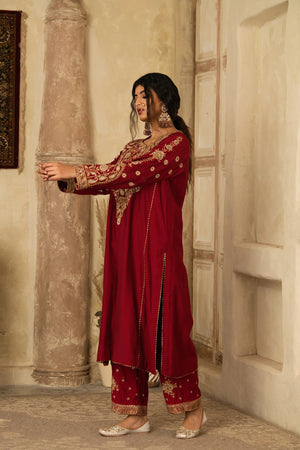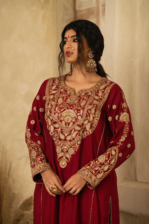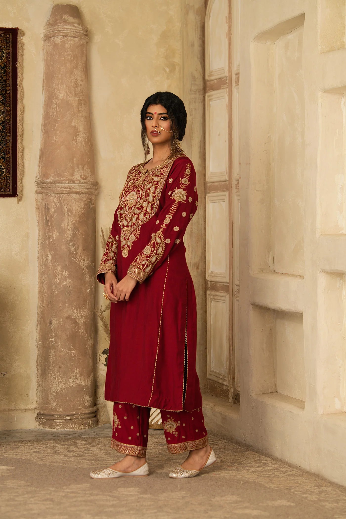 A straight kurti silhouette in slub fabric, highlighted with heavy and intricate embroidery, enhanced by delicate handwork — perfect for festive elegance.