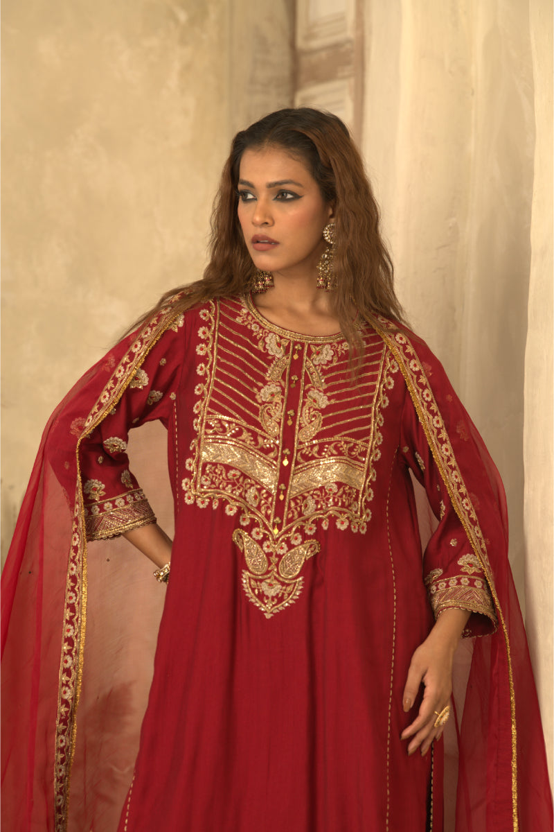A straight kurti silhouette in slub fabric, highlighted with heavy and intricate embroidery, enhanced by delicate handwork — perfect for festive elegance.