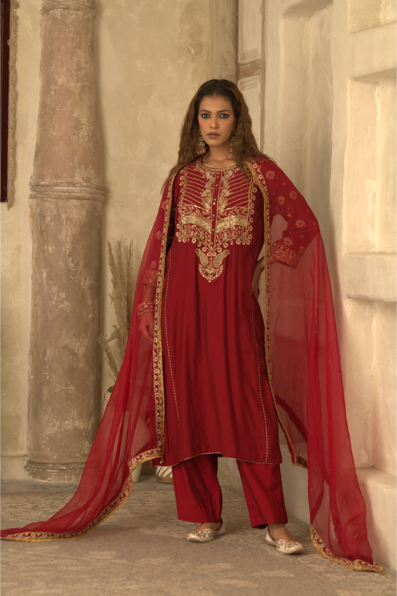 RED MUMTAZ BUTTI & JAAL SUIT SET
