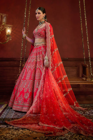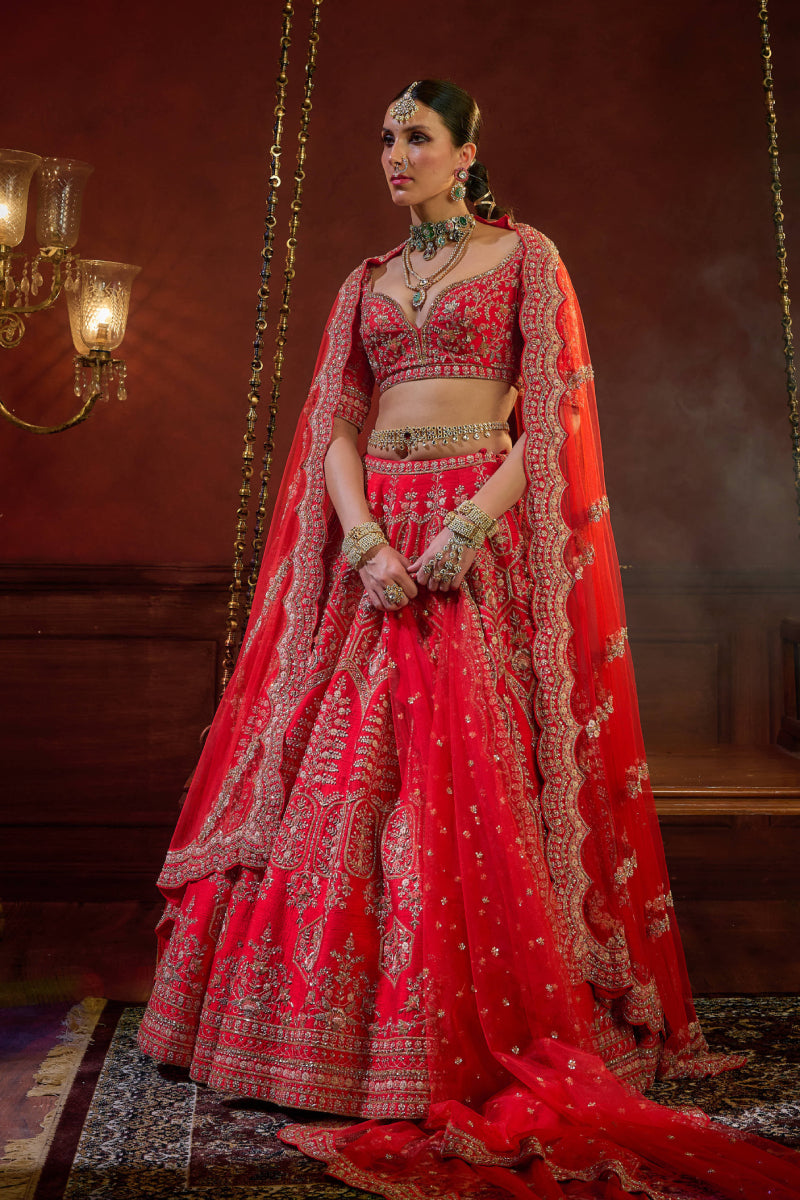 Red Raw Silk Hand & Machine Embroidered Lehenga Set