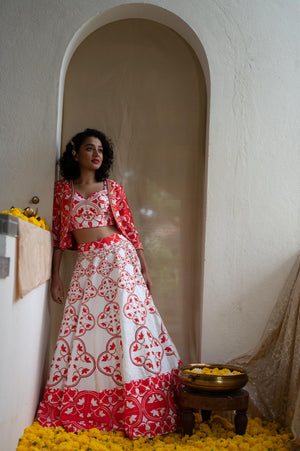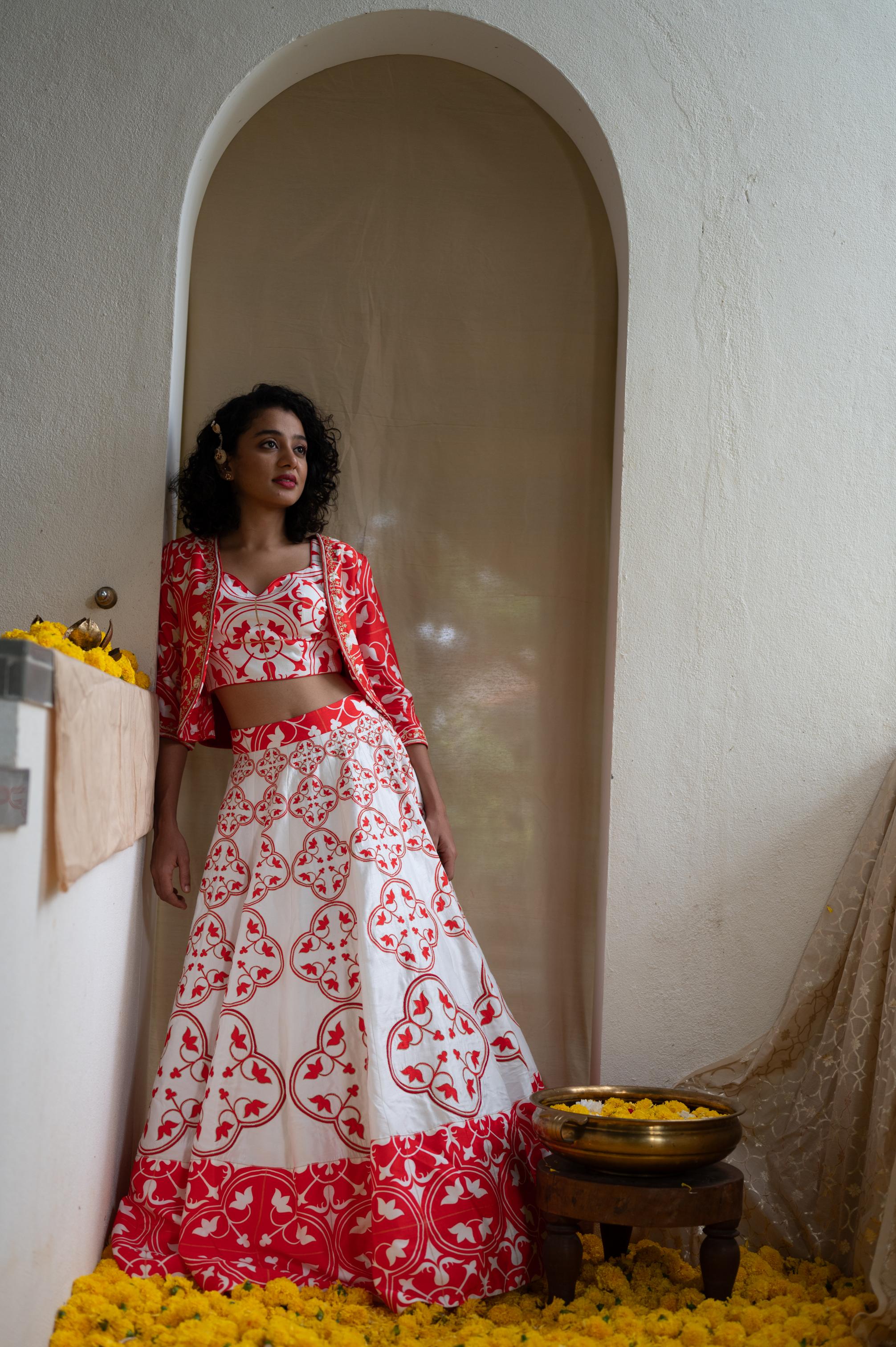 LEHENGA WITH POCKETS, PRODUCT WITH LINING MACHINE EMBROIDERY / DETAIL ON JACKET