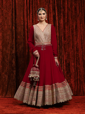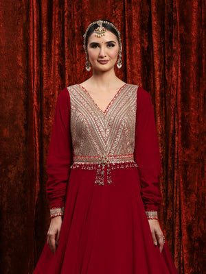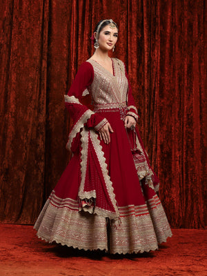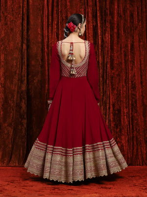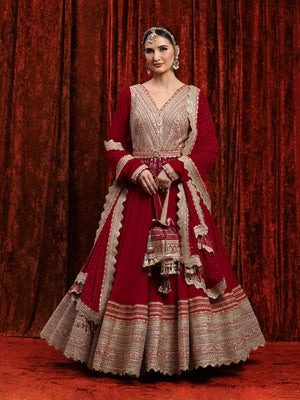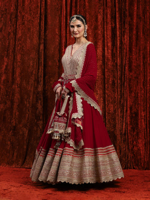 Embrace timeless elegance in our exquisite red silk chanderi anarkali suit, meticulously adorned with intricate gota, dori and badla work. Whispering tradition and craftsmanship, the delicate tassel embellishments add a touch of elegance. Paired with a matching georgette dupatta, also adorned with tassel detailing, this ensemble exudes grace and allure. The look is elegantly finished with a coordinating belt, adding a final touch of refinement.