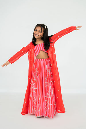 PINK-RED STRIPES BLOUSE PAIRED WITH LEAF JAAL EMBROIDERED LEHENGA AND BUTTI EMBROIDERED CAPE