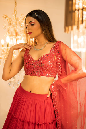 Featuring a Red tiered lehenga in georgette base paired with a matching Hand Embroidered Mirror work blouse and a Net with Mirror work dupatta.