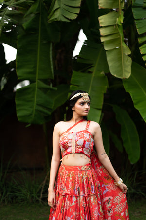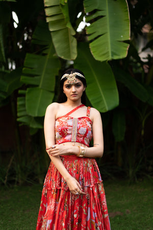 Featuring a red skirt in viscose base with hand embroidery and print. It is paired with a matching off-shoulder blouse having an attached draped dupatta. Style it with statement jewellery and heels for festive occassion.