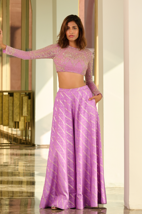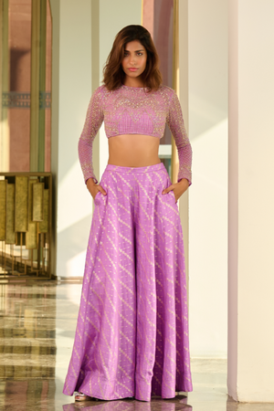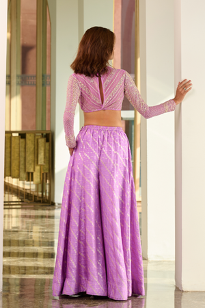 Lavender Jamewar Palazzo paired with intricately encrusted full sleeve net blouse