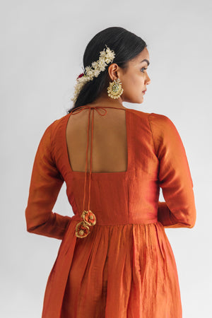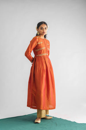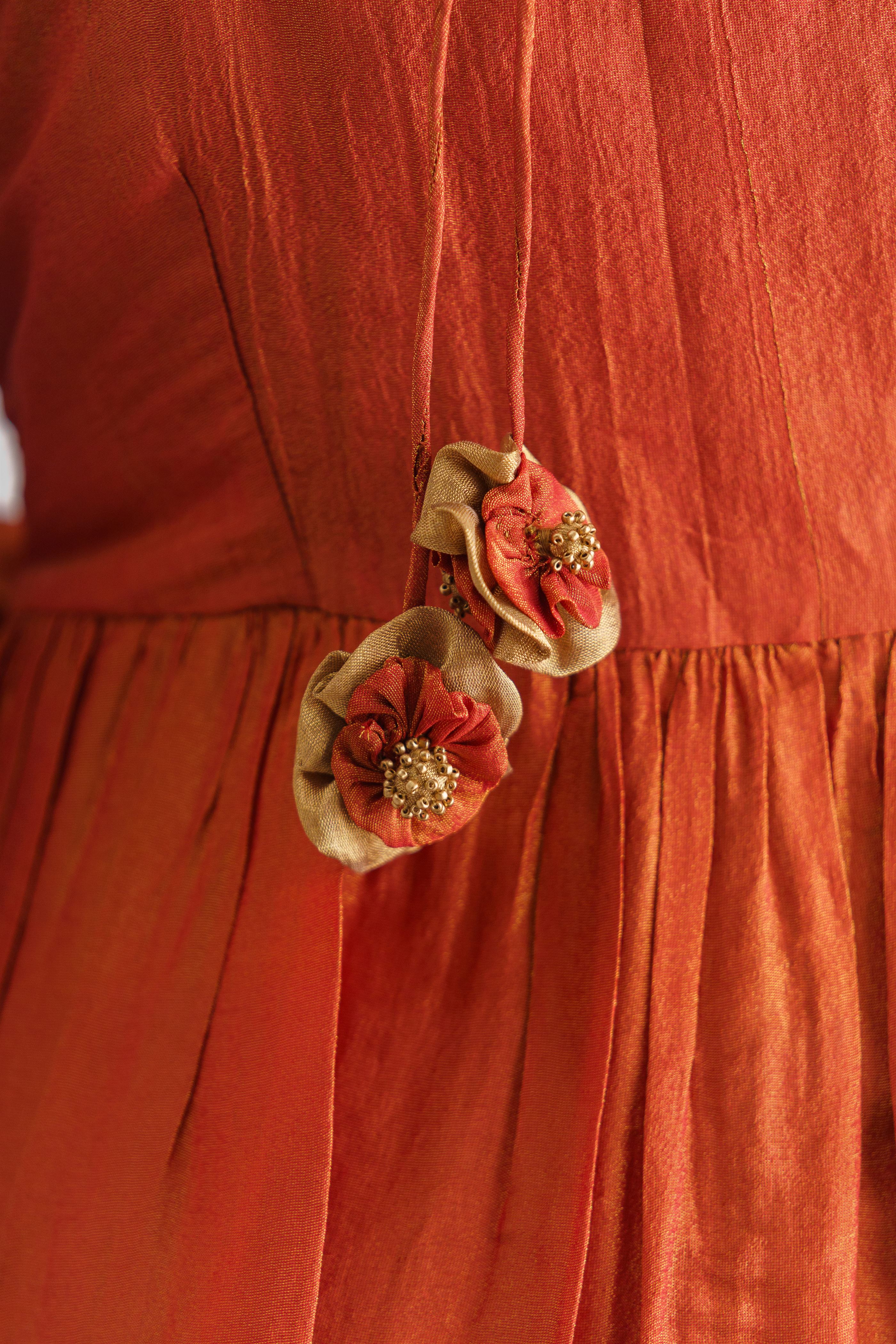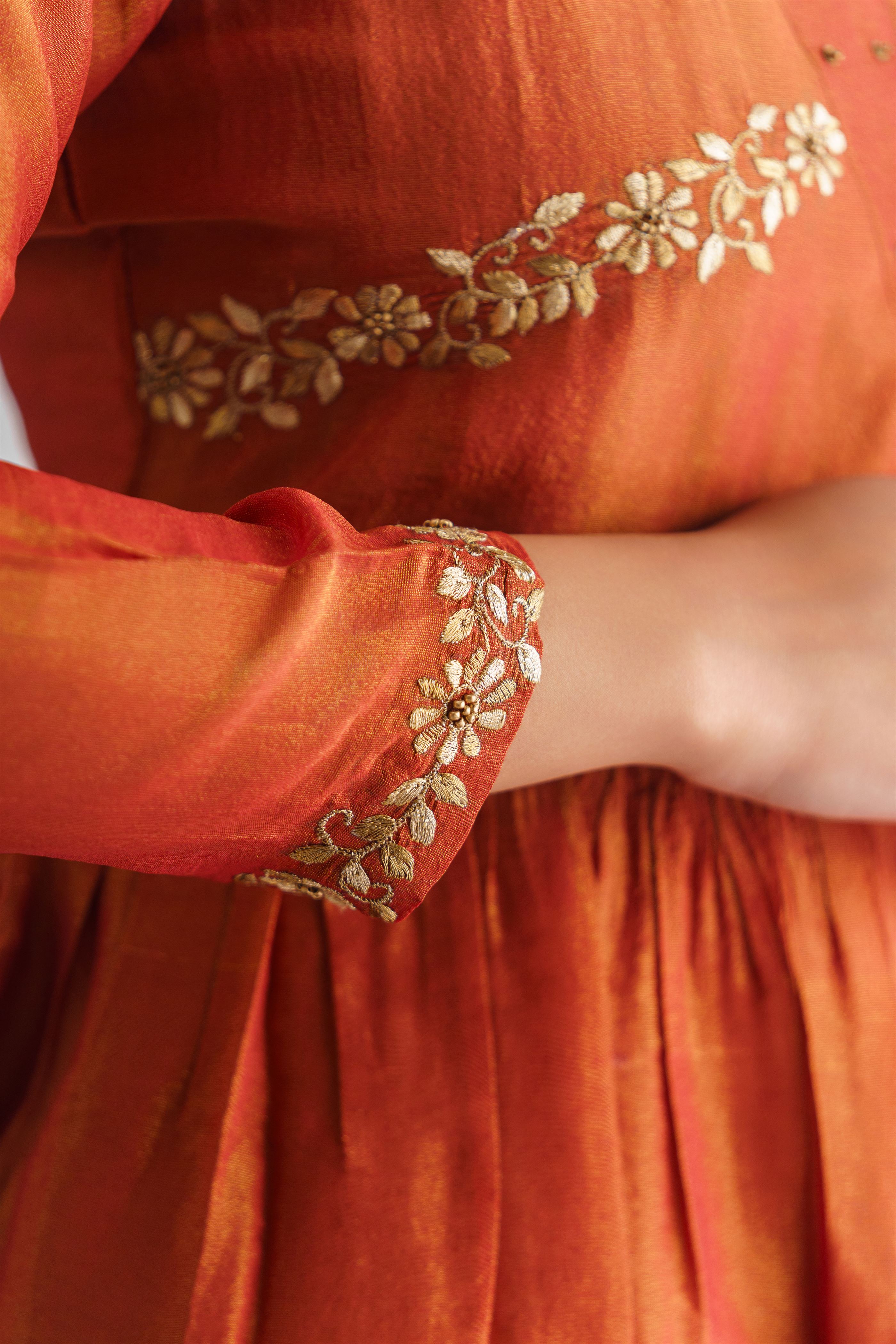 Impress everyone with the stunning beauty of this rust-orange anarkali kurta made of georgette tissue fabric. The kurta features delicate floral embroidery with resham thread on the sleeves and bust, enhanced with bead and sequin work. The round neck is accentuated with lovely potli buttons in contrasting golden fabric, making the kurta even more attractive. The upper body has a lining attached for added comfort.