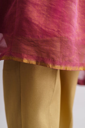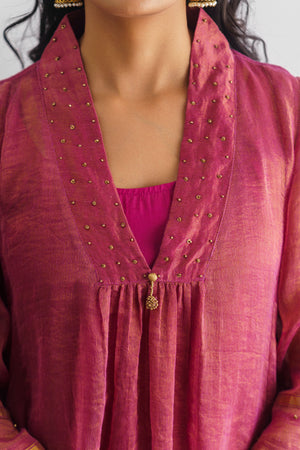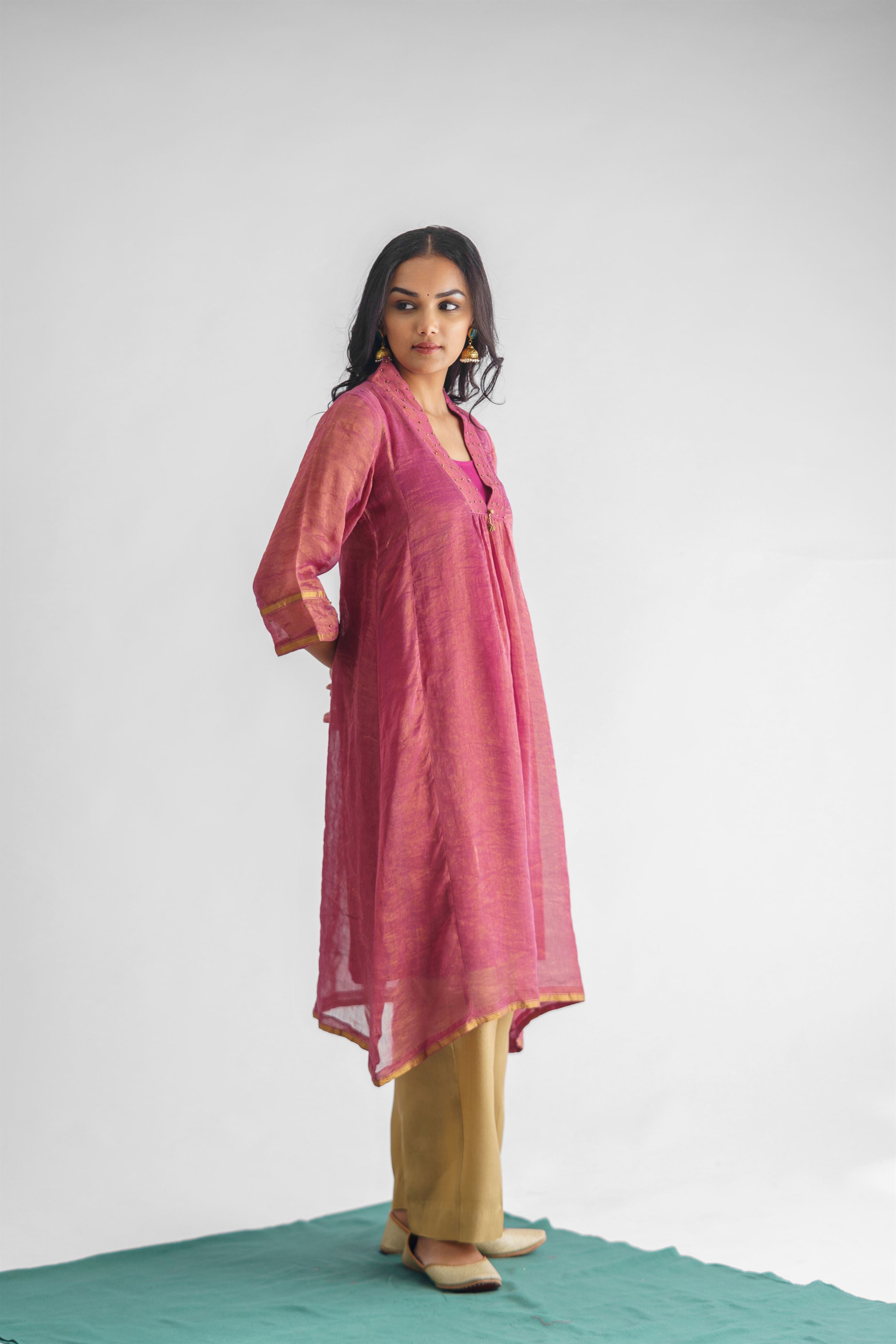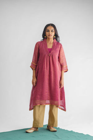 This elegant plum-coloured kurta with zari stripes exudes sophistication and grace. The neck panel is adorned with intricate bead and sequence work and is accentuated by a potli button with a beautifully embellished tassel hanging from it. The three-quarter sleeves are also embellished with beads and sequences. The silhouette is A-line and it comes with a slip. Comes with a slip.