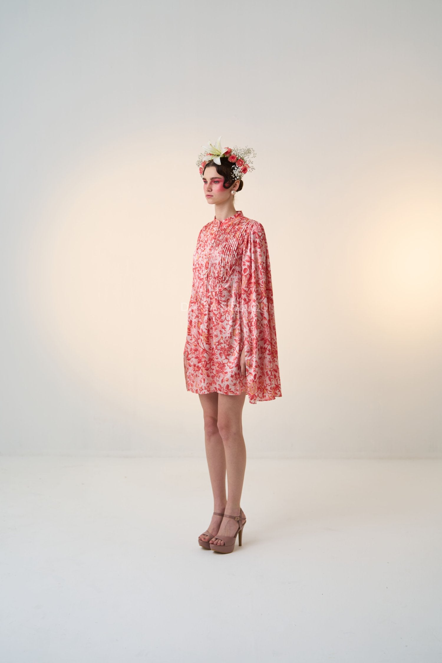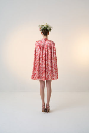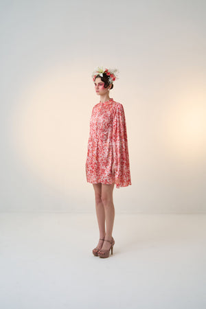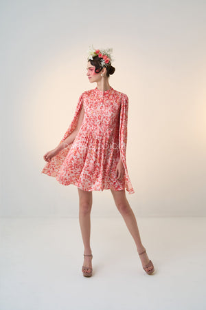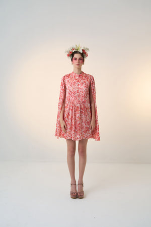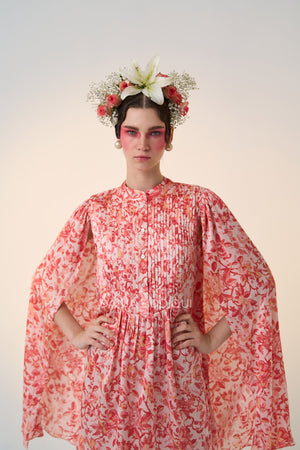 Coral Red, Pleated bodice, buttons ni front for closure, high collar neckline, attached cape.