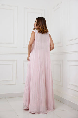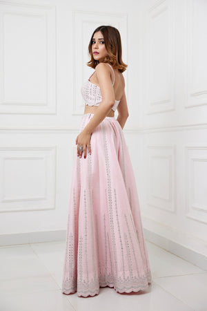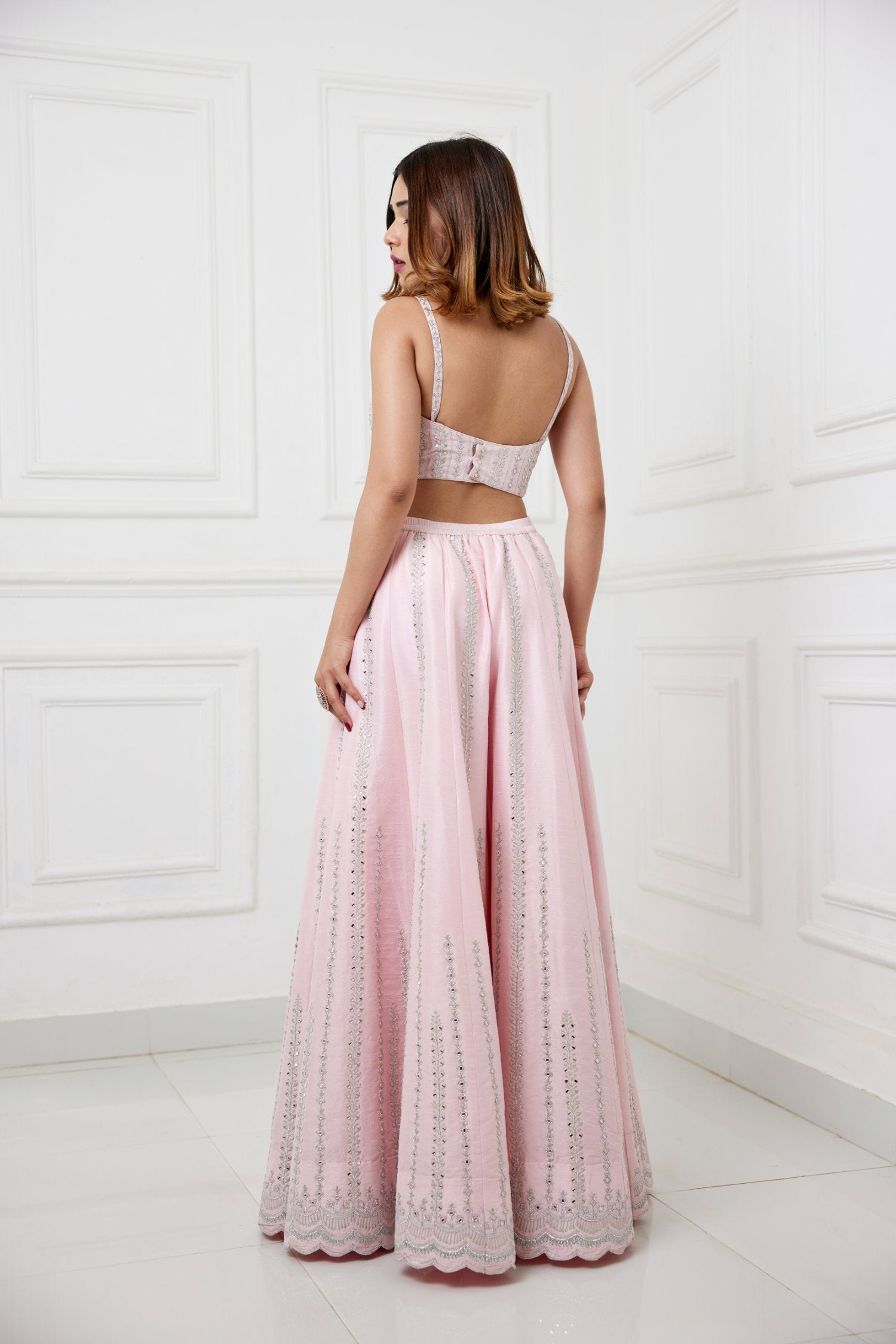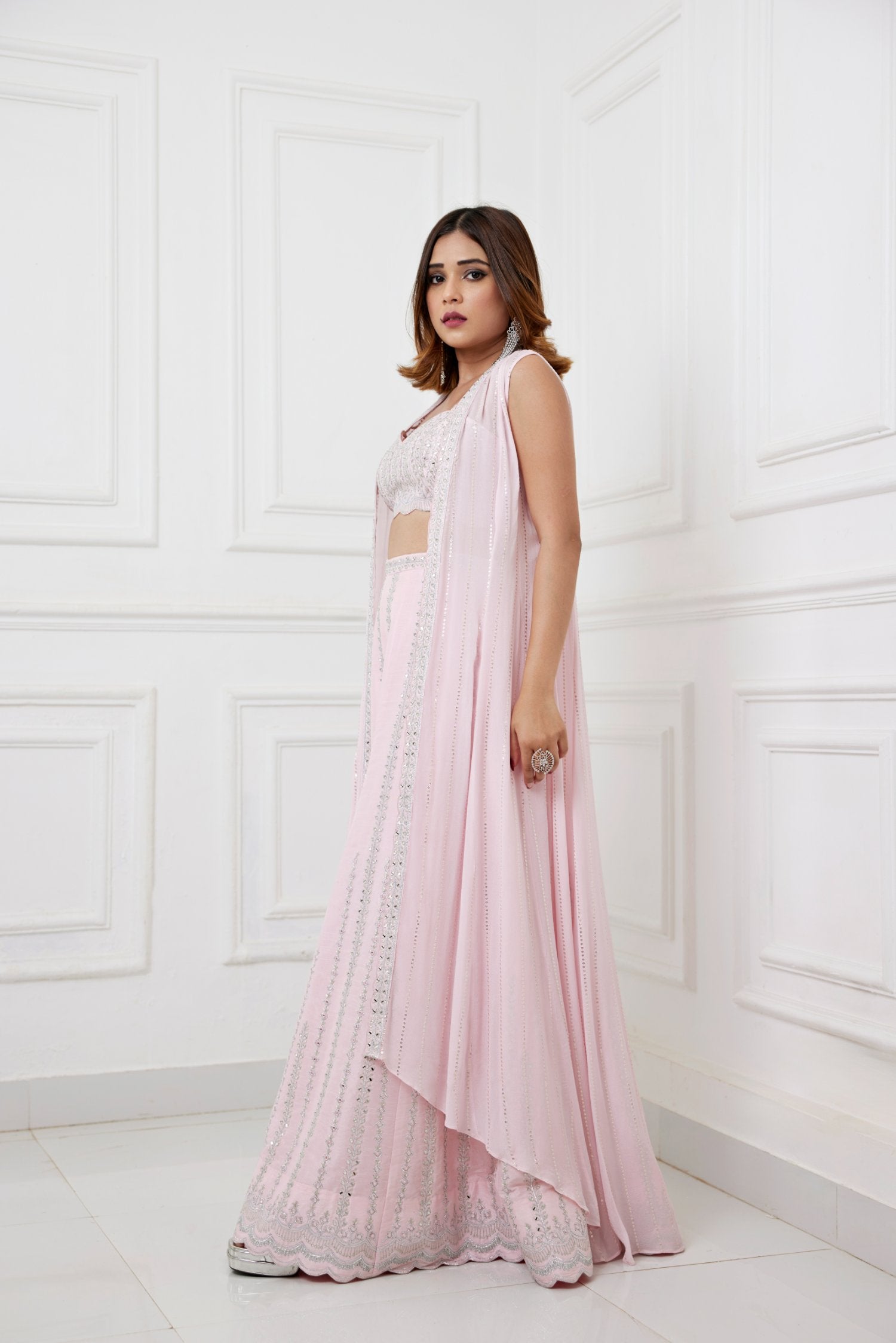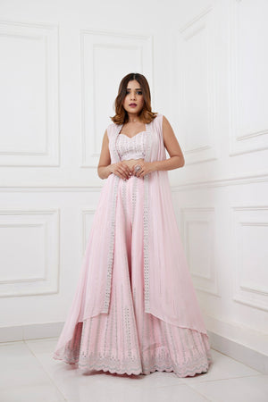 Mirror And Silver Zari Embroidered Spaghetti Neck Blouse And Flared Scallop Edged Pant Paired With Georgette Sequence Work Jacket.